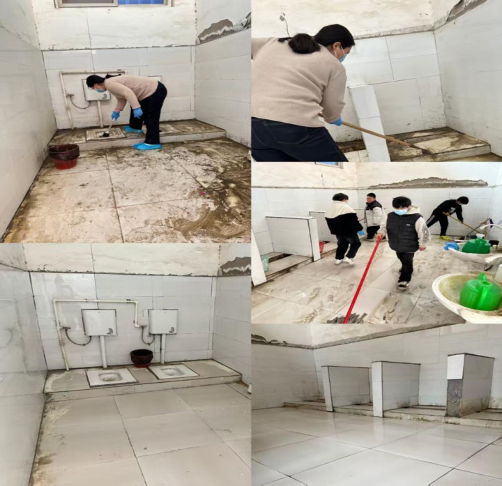 “校长也来和我们一起打扫啦!”孩子们的声音里满是惊喜。原本还有些拘谨的学生,看到校长毫无架子地俯身,用铁铲一点点铲除积留的污渍,也纷纷拿起工具跟上。男生们学着校长的样子,用力刮着瓷砖缝隙里的污渍;女同学们拎着水桶,一趟趟接水冲刷地面,连裤脚沾了污水也毫不在意。