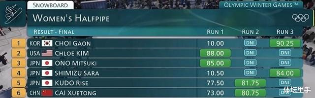 这场米兰冬奥会单板滑雪女子U型场地技巧决赛的最终成绩:崔佳恩90.25分第一,克洛伊-金88分第二,三位日本选手分列第三至第五,中国老将蔡雪桐80.75分获得第六,另外一位中国选手武绍桐78分排名第七。
