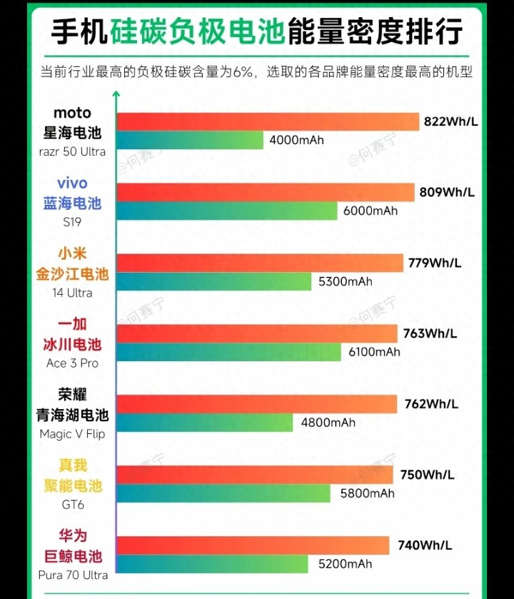 手机电池技术的发展一直备受关注,尤其是硅碳负极电池的能量密度提升,成为各大厂商竞争的焦点。从最新的数据来看,摩托罗拉的星海电池以822Wh/L的能量密度位居榜首,vivo的蓝海电池紧随其后,达到809Wh/L,小米的金沙江电池则以779Wh/L位列第三。这些数据表明,当前行业最高的负极硅碳含量为6%,各大品牌在电池技术上的竞争已经进入了一个新的阶段。