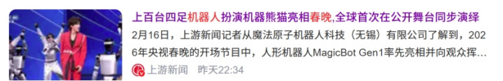 2月16日晚间,松延动力、宇树科技、魔法原子和银河通用四家具身智能企业登上春晚舞台,带来小品、歌曲、武术和微电影等多种表演形式。