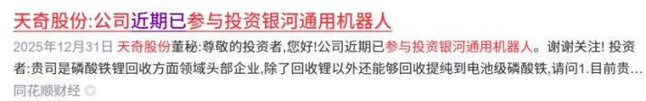 银河通用参股方:公司在互动平台上表示,公司近期已参与投资银河通用机器人。同时,公司与与北京银河通用机器人,设立合资公司天奇银河机器人有限公司。