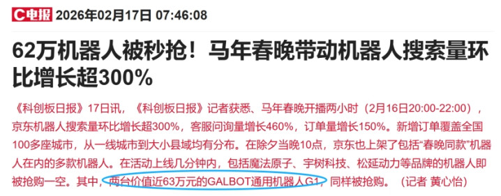 更加震撼的是,春晚同款机器人在京东机器人搜索量环比增长超300%,客服问询量增长460%,订单量增长150%。新增订单覆盖全国100多座城市,从一线城市到大小县域均有分布。