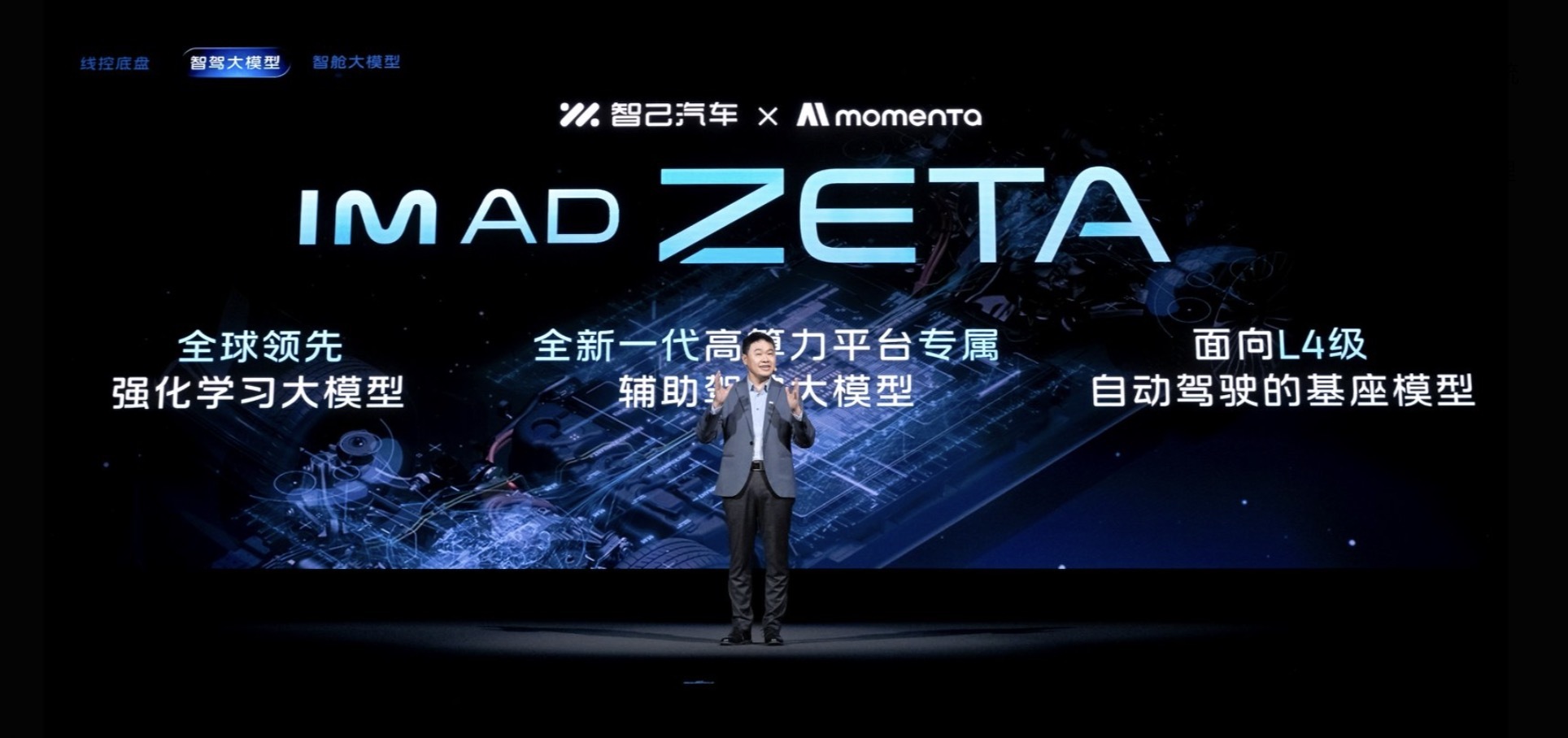 在全线控灵蜥数字底盘这个物理基座上,智己的“超级智能体”有两大创新技术。与Momenta联合推出的IM AD ZETA,直接面向L4级自动驾驶打造。它基于强化学习世界模型,通过在云端虚拟环境中进行亿万次“试错—反馈”循环,让AI自主习得最优驾驶策略,实现“先预判、再行动”。以L4级能力“降维”应用于当下的L2+级辅助驾驶,使其处理复杂场景的泛化能力和拟人化程度得到跨代际提升,从“更像人”迈向“超越人”。