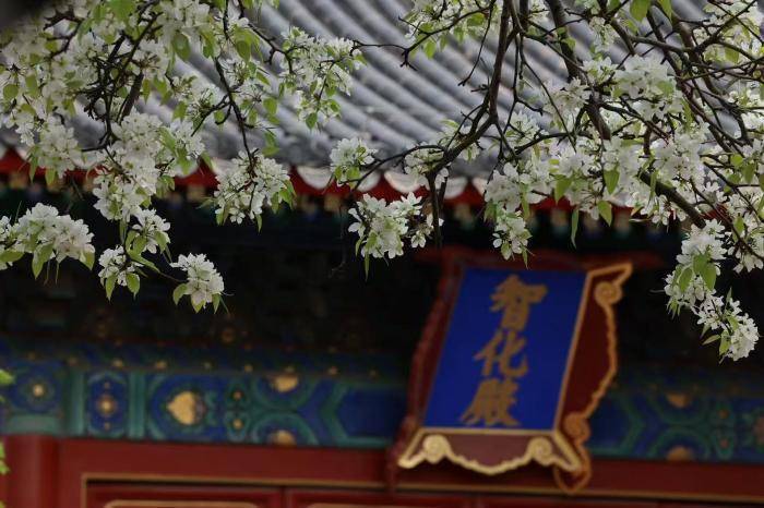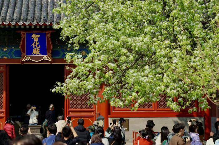 北京青年报记者在现场见到,智化殿红墙朱门搭配古雅蓝底金匾,梨花枝桠肆意舒展,洁白花瓣层层叠叠,在春日阳光映照下愈发清新。
