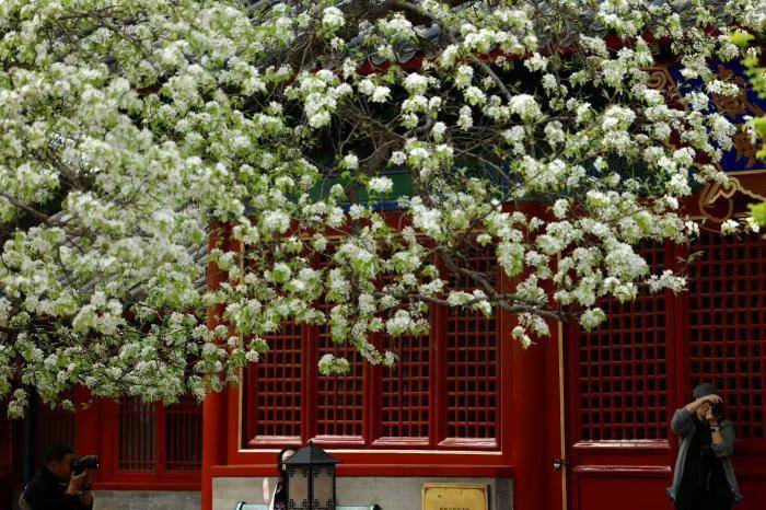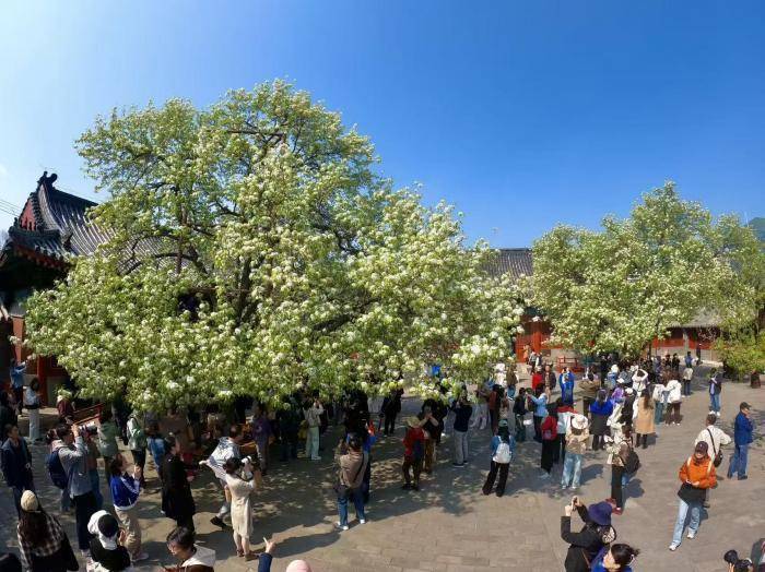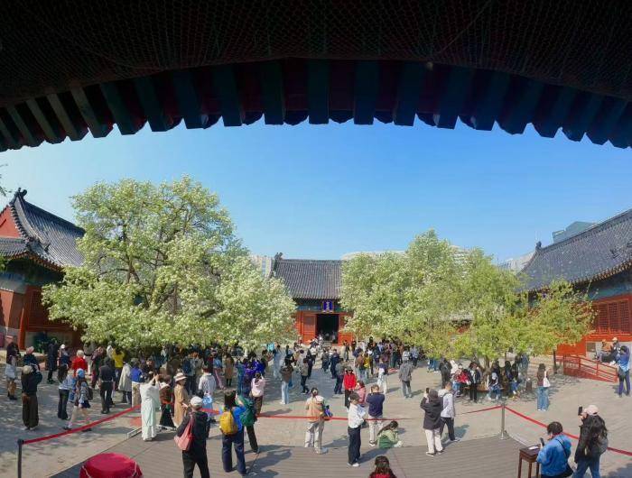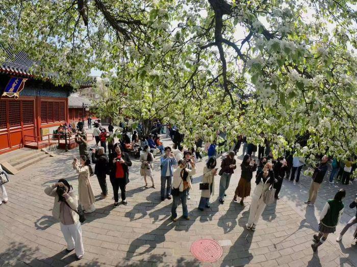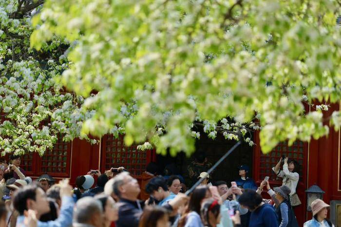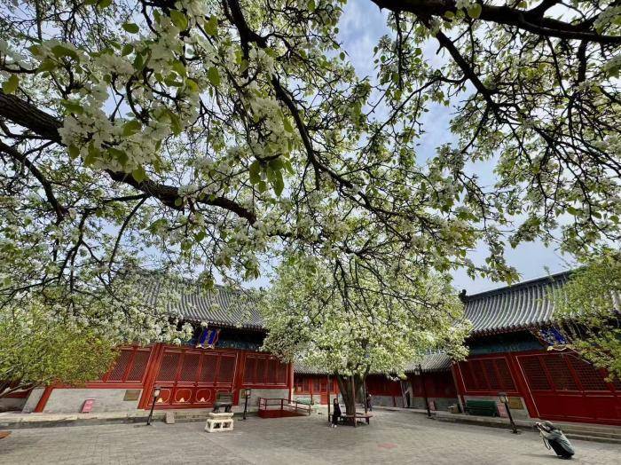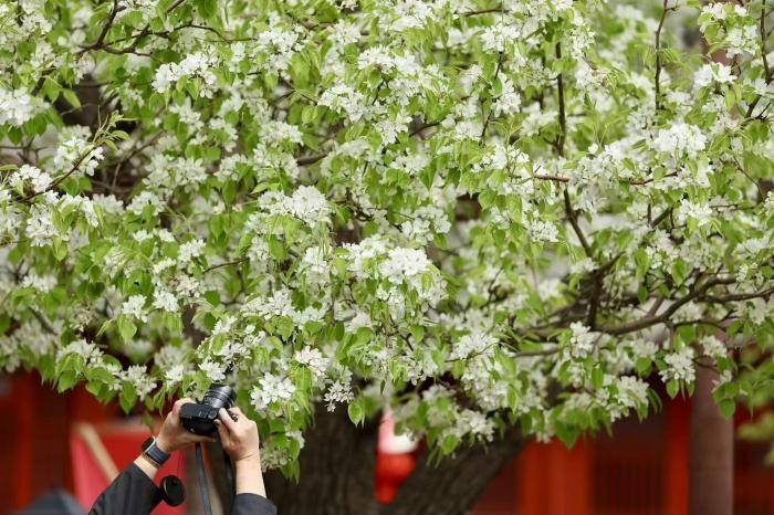 春风送暖,北京东城区智化寺内,两株百年梨树迎来盛花期。满树雪白繁花缀满枝头,如云似雪,与红墙灰瓦、明代古建相映成趣,勾勒出京城春日美景。